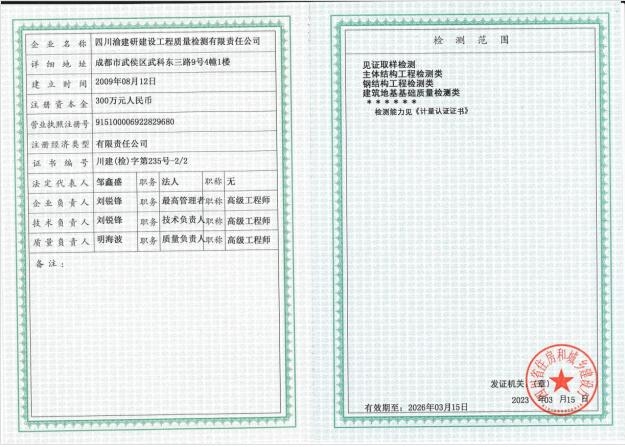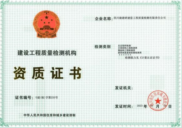 近日,經四川省住房和城鄉建設廳核準,重慶設計集團市建科院所屬子企業四川渝建研建設工程質量檢測有限責任公司(以下簡稱渝建研)申請重新核定的建設工程質量檢測機構資質于20233成功獲批并順利取證。