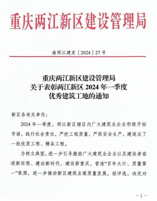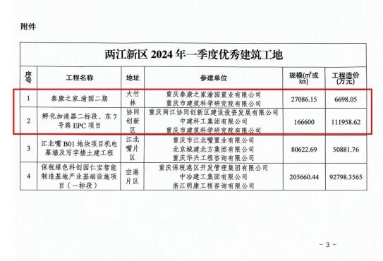 近日,由重慶設計集團市建科院公司承擔監(jiān)理的泰康之家·渝園二期項目以及孵化加速器二標段、東7號路EPC項目在眾多建筑工地中脫穎而出,獲重慶兩江新區(qū)建設管理局“2024年第一季度優(yōu)秀建筑工地”表彰。